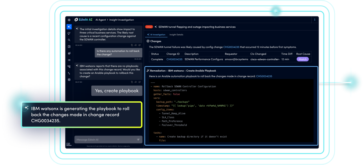 The platform combines three layers of automation: Edwin AI for contextual diagnosis, IBM watsonx Code Assistant for generating remediation playbooks, and Red Hat Ansible Automation Platform for secure execution. Together, these technologies close the loop from detection to resolution with audit trails and policy controls.