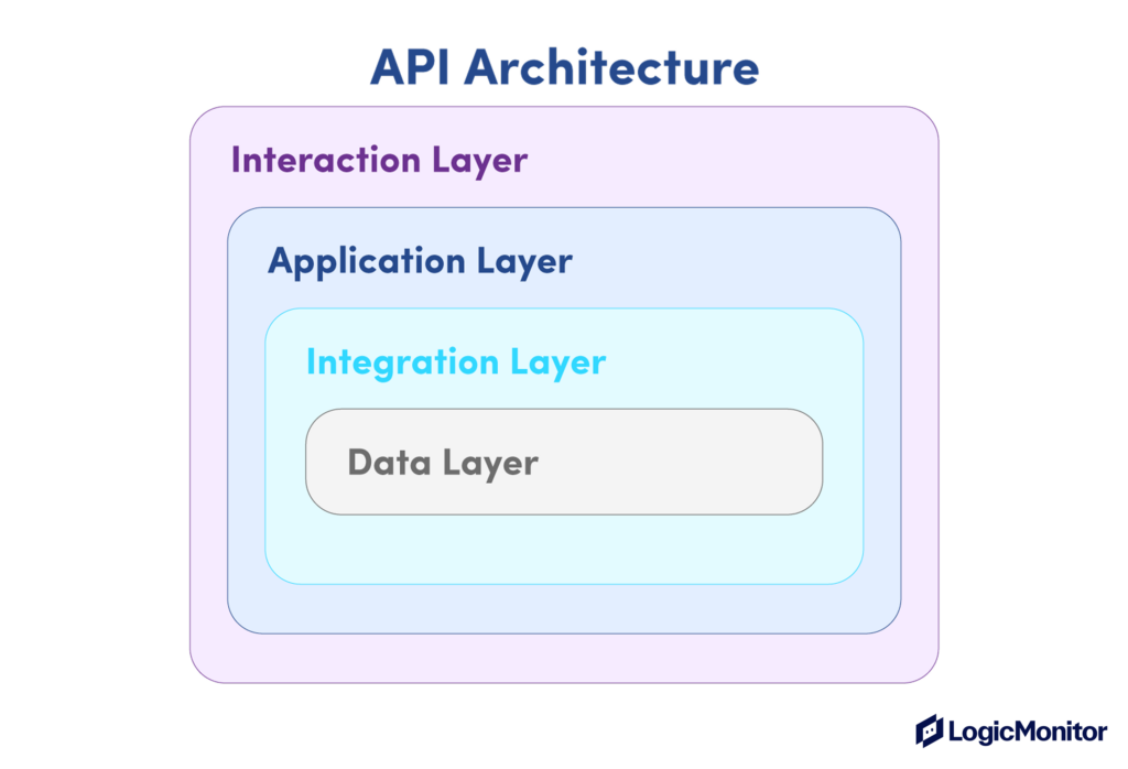 API architecture spans four distinct layers (data, integration, application, and interaction), each with responsibilities that must work in concert.