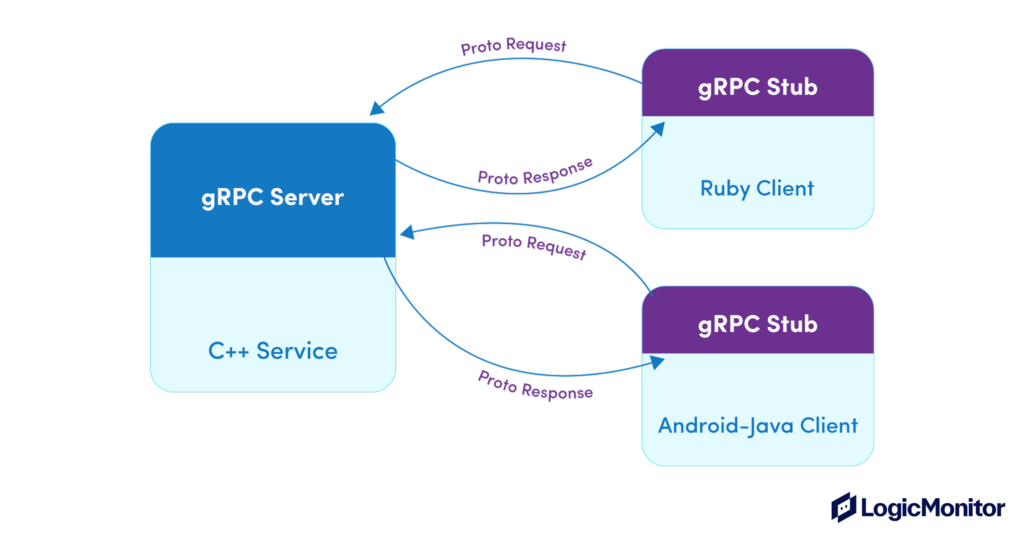 gRPC employs Protocol Buffers, a language-neutral format for defining data structures and messages. It enables efficient communication between diverse programming languages. Like REST, it supports single request, single response communication, but being a more modern API style, it also has built-in support for server-streaming (continuous server updates), client-streaming (sending a stream of data), and bidirectional streaming (real-time communication).
