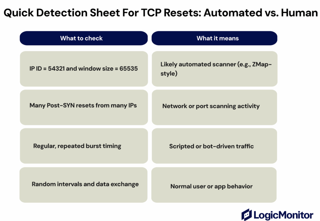 Not all TCP resets come from real users or broken apps. Many are caused by automated scanners that send test packets across the internet to check which systems or ports are open.