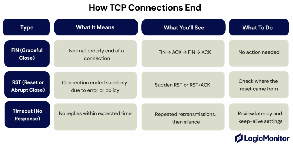 Each stage of a TCP session gives you clues about what caused the reset if it’s normal cleanup, a setup issue, or network interference.
