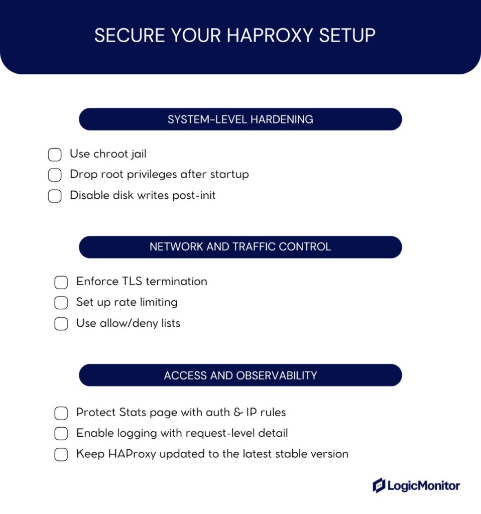 Here’s a quick security checklist you can apply to any HAProxy deployment: