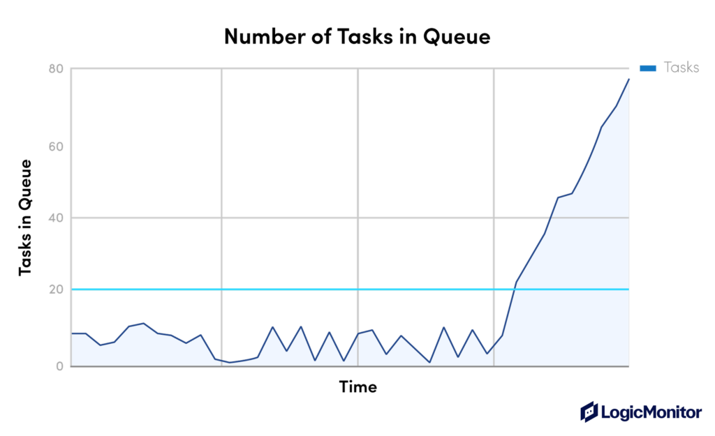 In the above example, imagine a job is created with 100 tasks. This would spike the value to above 20. However, the system is working fine, and the number will shortly return to a safe value. This is an example of an alert that is too noisy and could be adjusted to something such as “over the threshold for more than 5 minutes”.