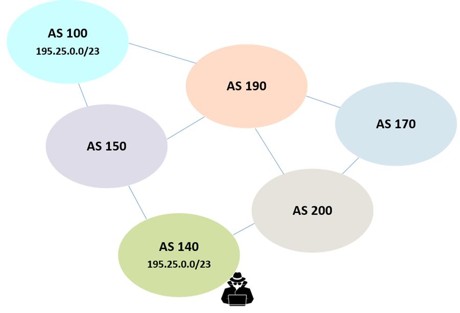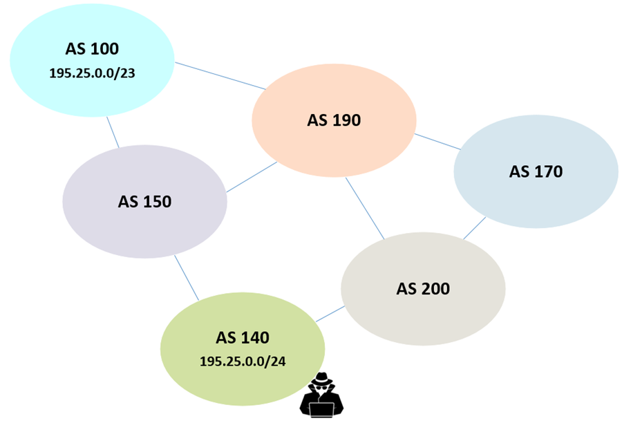 In the case of the above diagram, only AS 190 is assured of having correct routing to the 195.25.0.0/23 prefix. The others will either have AS 140 as the destination or will have unpredictable results due to AS_PATH tiebreakers.