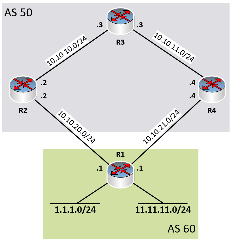 Let’s say we want to ensure that all traffic headed outside AS 50 is sent via R4 and not via R2. We can specify this behavior by changing the local preference assigned to a particular neighbor. In other words, we can configure R4 to inform R3 within its updates that it has a higher LOCAL_PREF than other potential exit points from the local AS.