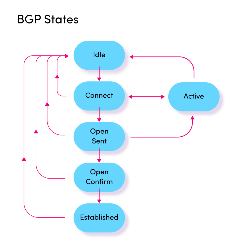 BGP routers establish neighbor adjacencies or peerings with other BGP routers before exchanging prefix and routing information. These adjacencies are established by going through a specific process of traveling through various neighbor adjacency states. This process can be visualized in a flow diagram which indicates the states the BGP routers go through to establish this adjacency, which is officially called a Finite State Machine or FSM. Please read our article on BGP states to learn more.e RPKI, these technologies introduce mechanisms that help mitigate hijacking and malicious attacks on your internet routing.