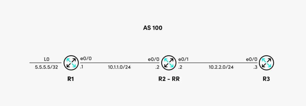 For this walkthrough, let’s use a simple configuration with three routers and a single Route Reflector in the middle.