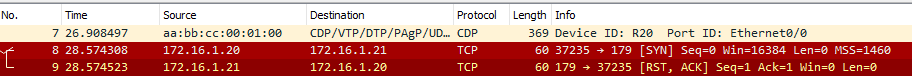 At this point, we can see how R20 is trying to establish a TCP session, but it’s failing as we haven’t configured R21 yet.