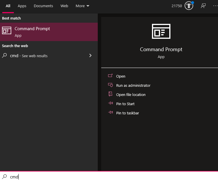 Running a traceroute is very simple. The first step is to bring up a command prompt on your computer. The specific method to bring this up will depend on what operating system you are using. For Windows 10, for example, you can simply click on the start button and type CMD to bring up the options below.