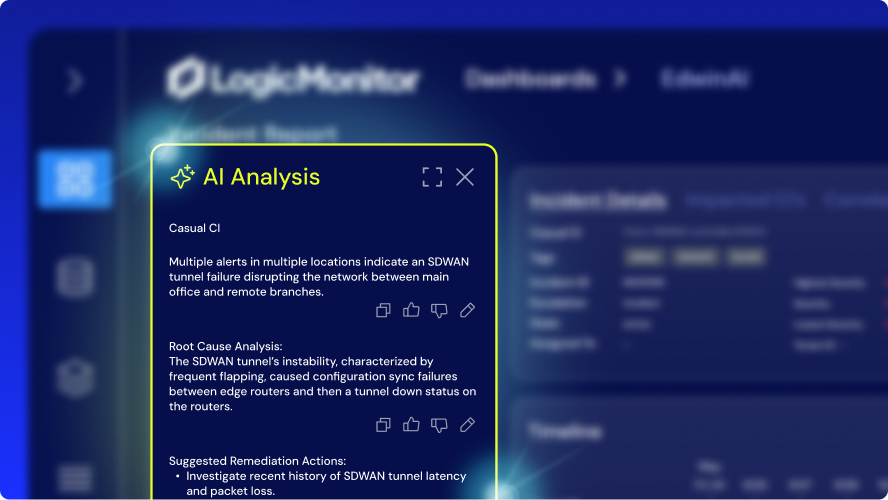 AI Automation is a LogicMonitor solution that delivers self-healing IT operations. It uses agentic AIOps to automatically detect issues, perform root cause analysis, and trigger remediation workflows—reducing downtime and manual effort across hybrid and multi-cloud environments.