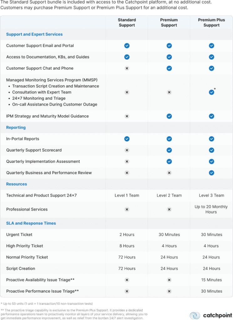 - a. APPLICABILITY; SUPPORT PLAN. Catchpoint support is provided in accordance with the support plan identified on the applicable Order (the “Support Plan”). Standard Support is included with access to the Catchpoint Services at no additional cost unless otherwise stated in an Order. Premium Support and Premium Plus Support may be purchased for an additional fee as set forth in the applicable Order.