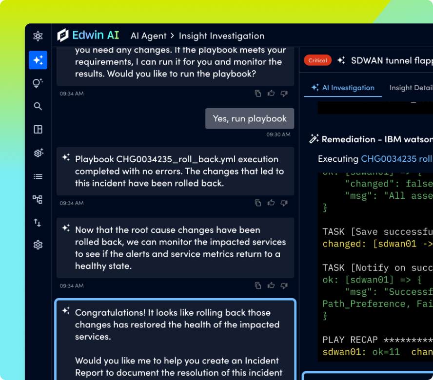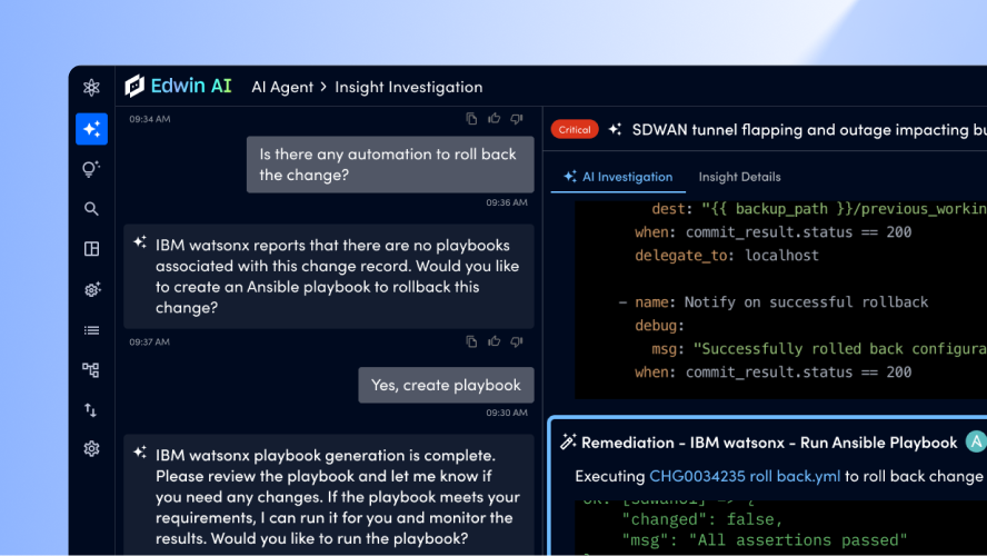Edwin AI, IBM watsonx, and Red Hat Ansible close the loop from detection to resolution, so your systems fix themselves and your teams stay focused on growth.