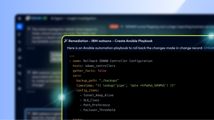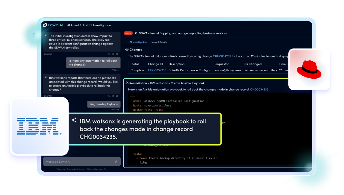 Edwin AI diagnoses root causes in context, watsonx generates precise remediation playbooks, and Ansible executes them at scale.