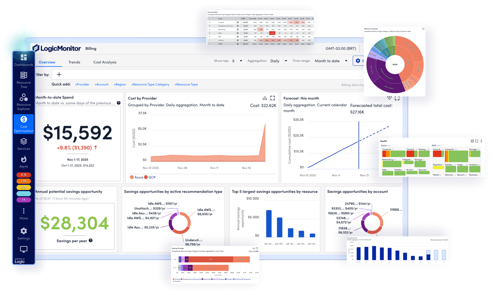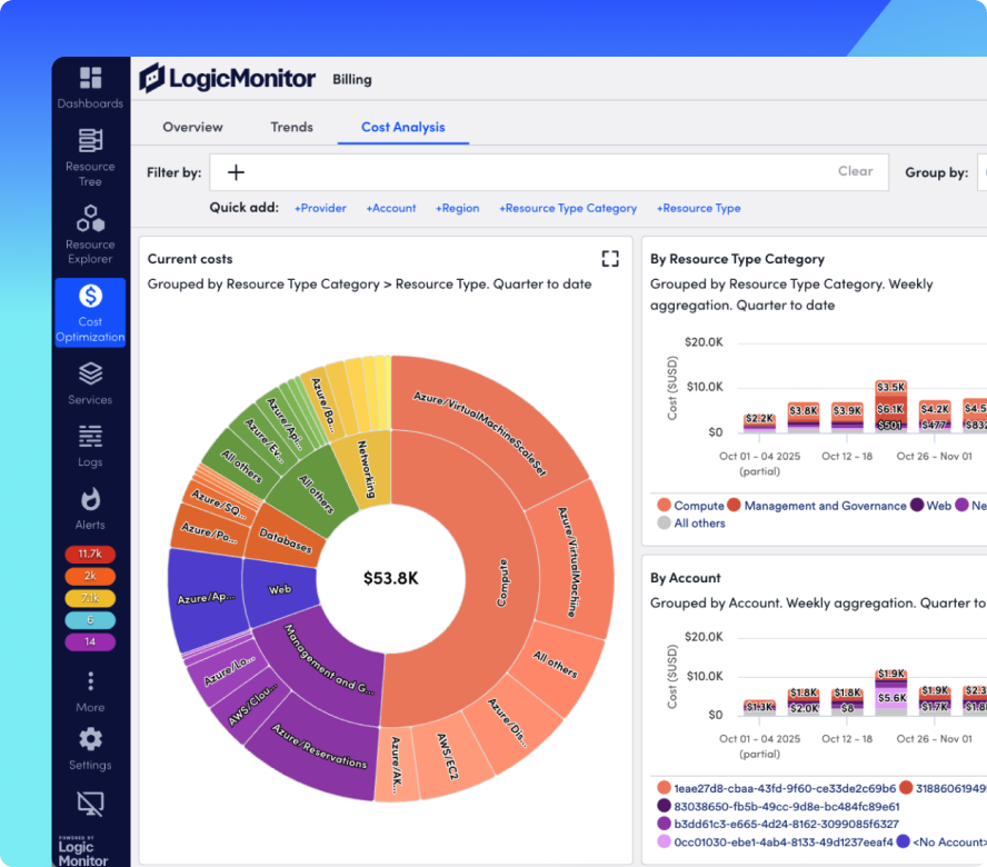 LogicMonitor supports cost visibility across AWS, Azure, and Google Cloud, with unified dashboards that present multi-cloud spend in a single view. Cost data is standardized using the FinOps Foundation FOCUS format and property normalization for consistent reporting. Cost optimization recommendations for AWS and Azure include compute, storage, database, and networking resources powered by real utilization data.
