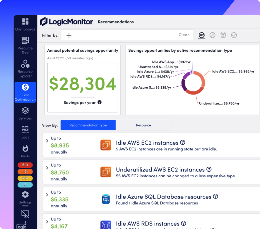 Teams gain visibility into cloud spend as soon as cloud billing data is connected to the LogicMonitor platform. For customers already using LogicMonitor for cloud monitoring, recommendations populate immediately, leveraging existing performance and utilization telemetry to surface actionable opportunities and begin reducing cloud costs.