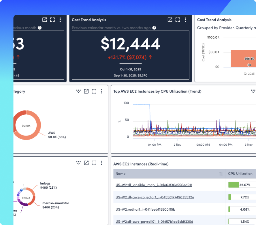 Interactive dashboards enable deep analysis of costs. ITOps teams can conduct deep cost analysis so they can isolate cost drivers, diagnose spikes, and make adjustments.