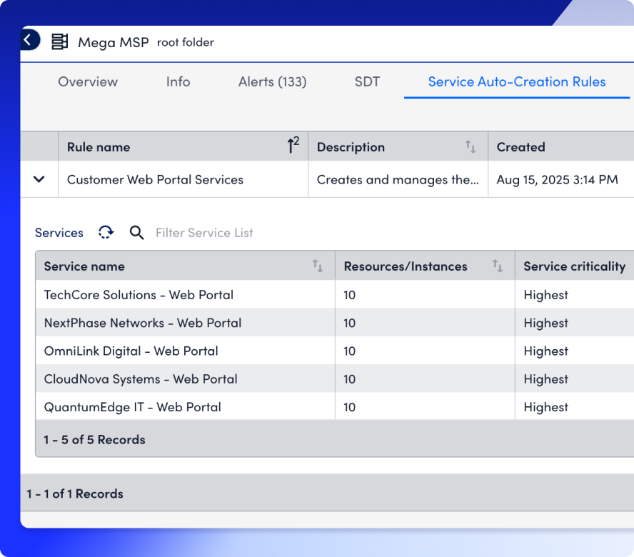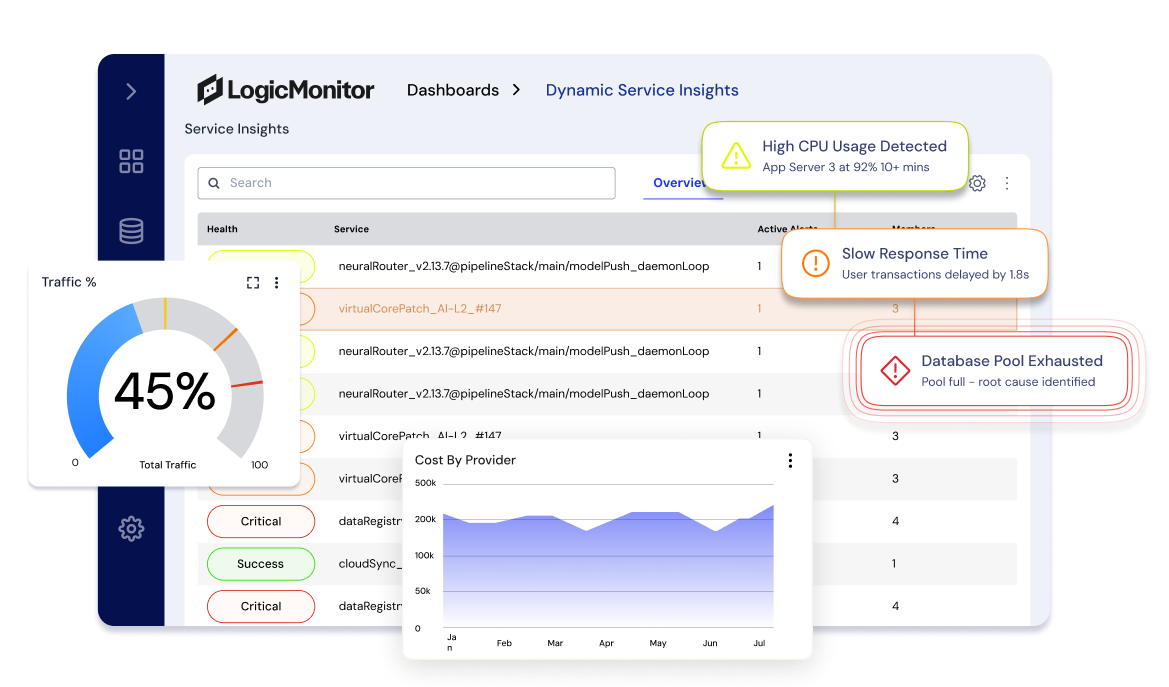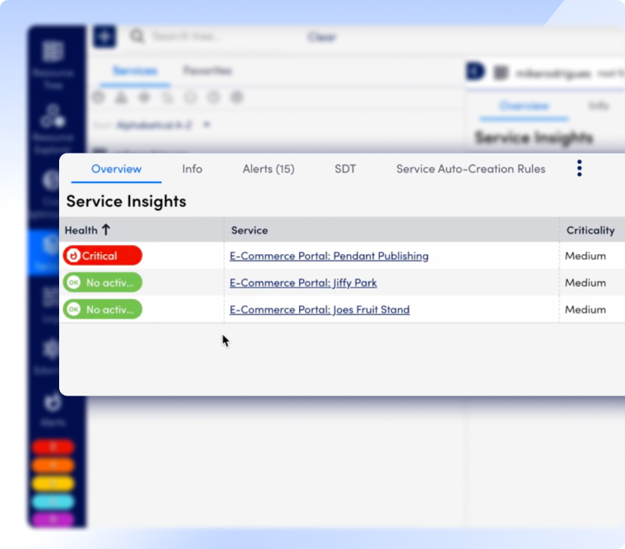 Dynamic Service Insights consolidates infrastructure alerts into a single service impact view, allowing teams to focus solely on impacts that affect business continuity. No more wading through floods of low-impact alerts.