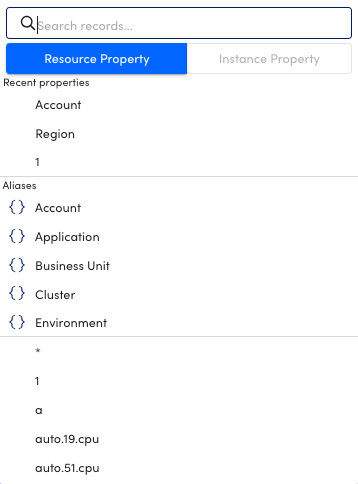 Note: At least one resource property must be added before you can add an instance property. - Type a value for the property in the Search records field, or select a value for the property from the list of values displayed for the property.