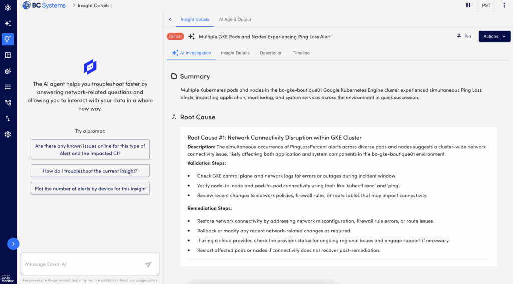 Edwin AI Agents are embedded in the Edwin platform and enable you to interact with insights, alerts, and data. These agents streamline common tasks such as data exploration, incident investigation, and documentation retrieval by responding to user prompts with contextual, AI-generated results.