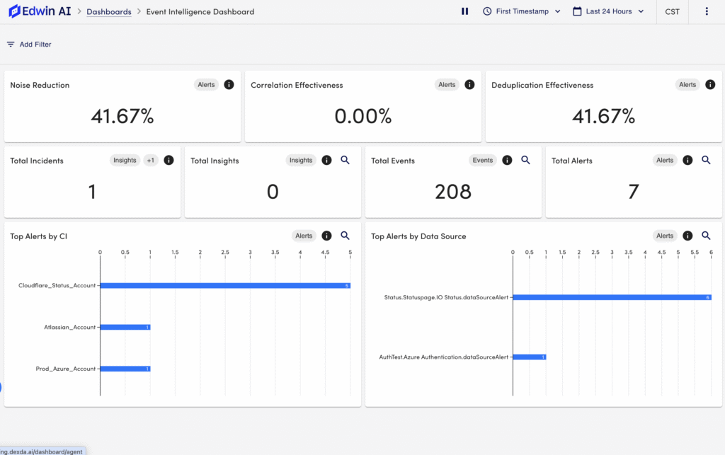 The Edwin AI Event Intelligence Dashboard provides a centralized view of alert and event activity and summarizes the impact of noise reduction, correlation, and deduplication (Event & Alert Intelligence capabilities).