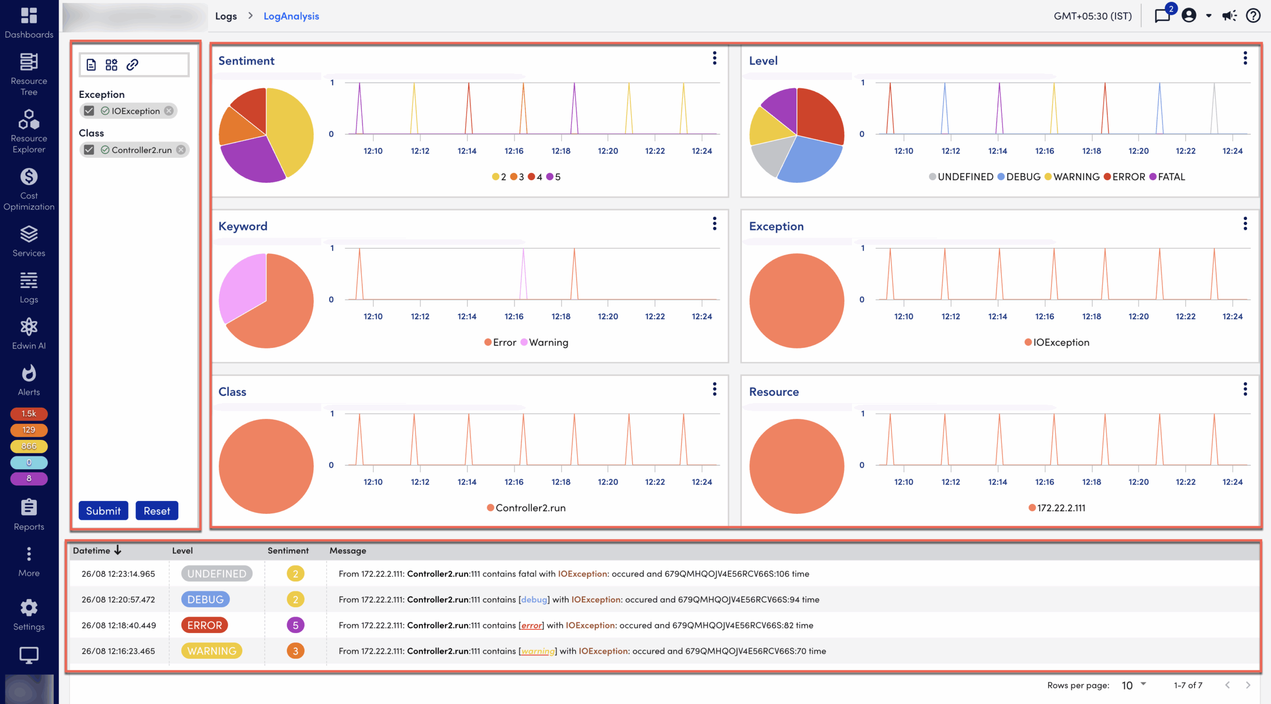 - Logs Table— The logs table displays the filtered logs in a meaningful way, with extra information like sentiment and highlighted keywords.