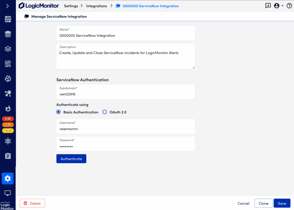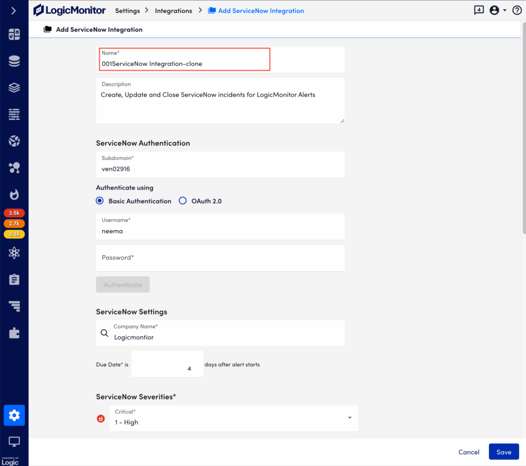 Note: When you clone an integration, in the Name field, the name of the integration is appended with a (-) hyphen and the word clone. You can edit this name if you want.