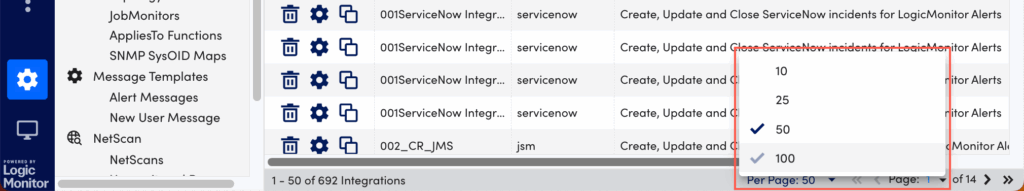 Select the Per Page option and select the number of integrations you want to display per page. By default, 25 integrations are displayed per page.