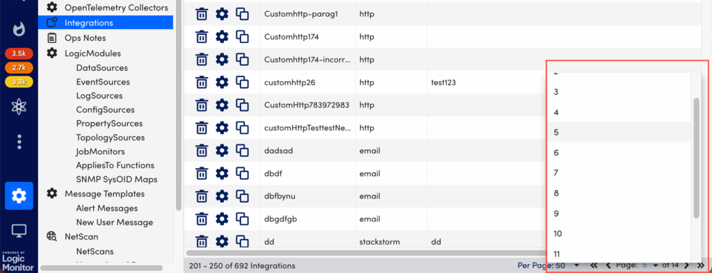 Select the paging arrows to move through integrations pages or select a page number from the list.